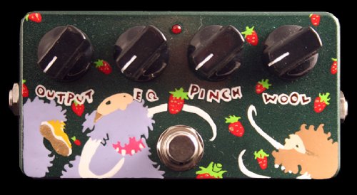 A sensitive and touchy bass fuzz with tremendous bottom end and a beautiful harmonic structure that sounds blistering with a guitar, too.The harmonic structure can be radically altered using the "PINCH" knob. It adjusts the pulse width of the waveform.In the leftmost position, the waveshape is quite symmetrical which produces a smooth creamy sound. Turning it up slightly introduces lovely intermodulation distortion. Turning it clockwise narrows the waveshape into asymmetrical pulses, making the tone reedier and brassier. This also introduces an unusually smooth 'gating' action, which gives you an absolutely eerie silence between notes.At most settings you will notice that low frequency pressure is preserved. This circuit has a frequency response that continues several octaves below audibility. The subs will knock everything off of your amps, so put the the bottles on the floor. No kidding.The "WOOL" knob adjusts the amount of fur around the note. The "EQ" knob tilts the spectral response, turning to the left adds lows and softens the highs. Turning to the right adds highs, then mids, and finally reduces lows. the "OUT" knob Is designed for smooth repeatable level settings.